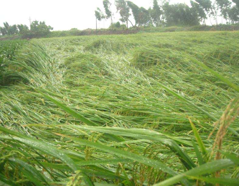 水稻成熟后,茎秆易失水干枯,要尽早收割脱粒,否则遇较大风极易倒伏。风大、风多、风道、风口等处最好不要栽培水稻,如确要栽培,事前应栽植水杉等防护林或建挡风墙,以控制或减轻水稻倒伏的发生。