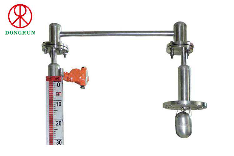 浮标磁翻柱液位计是根据力平衡和磁钢的磁性耦合作用研制而成,液位升降时,浮子会随着升降,顺着导杆上下移动时,用钢丝绳牵连另一端的磁钢(在容器外侧)经磁耦合作用驱动位于容器外侧的指示器的翻柱翻转,指示器的红、白界位处会显示容器中介质的液位高度。