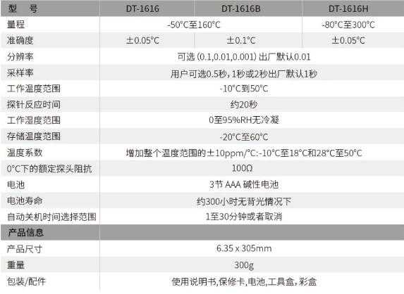 准确度为±0.05°C(DT-1616);量程为-50°C~160°C。