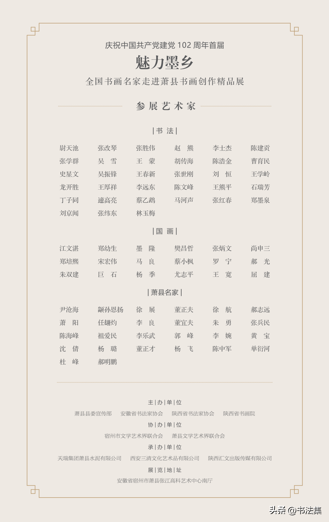 7月17日上午10:30,由萧县县委宣传部、安徽省书法家协会、陕西省书法家协会、陕西省书画院主办,宿州市文联、萧县文联协办,天瑞集团萧县水泥有限公司、西安三清文化艺术品有限公司、陕西汇文出版传媒有限公司承办的魅力墨乡——全国书画名家走进萧县书画创作精品展在安徽省宿州市萧县张江高科艺术中心南厅开幕。