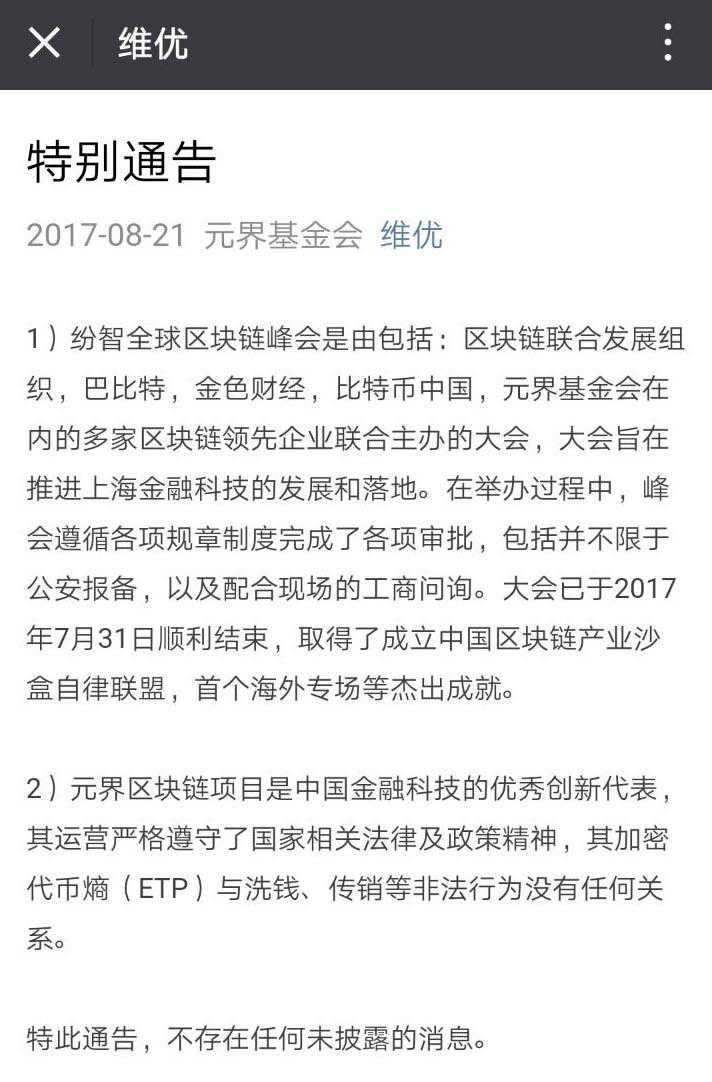 经界面新闻查证,浦东市场监管局所提及的全球区块链峰会实为7月30日至31日举办的Finwise纷智·全球区块链峰会,被点名的“上海某软件技术有限公司”应为上海艾固商务咨询有限公司,不过该公司一直以“维优咨询”对外进行宣传,自称是区块链行业的领军企业,维优元界是维优团队基于区块链技术开发的去中心化项目。