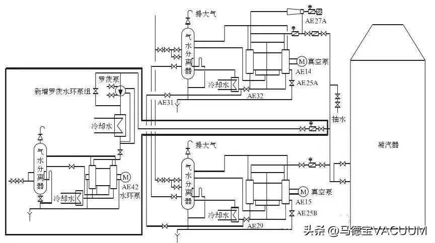 某电厂采用罗茨水环泵二级泵组,连接在抽汽母管上,与原2台真空泵并联使用,改造后的真空泵系统如下图所示。