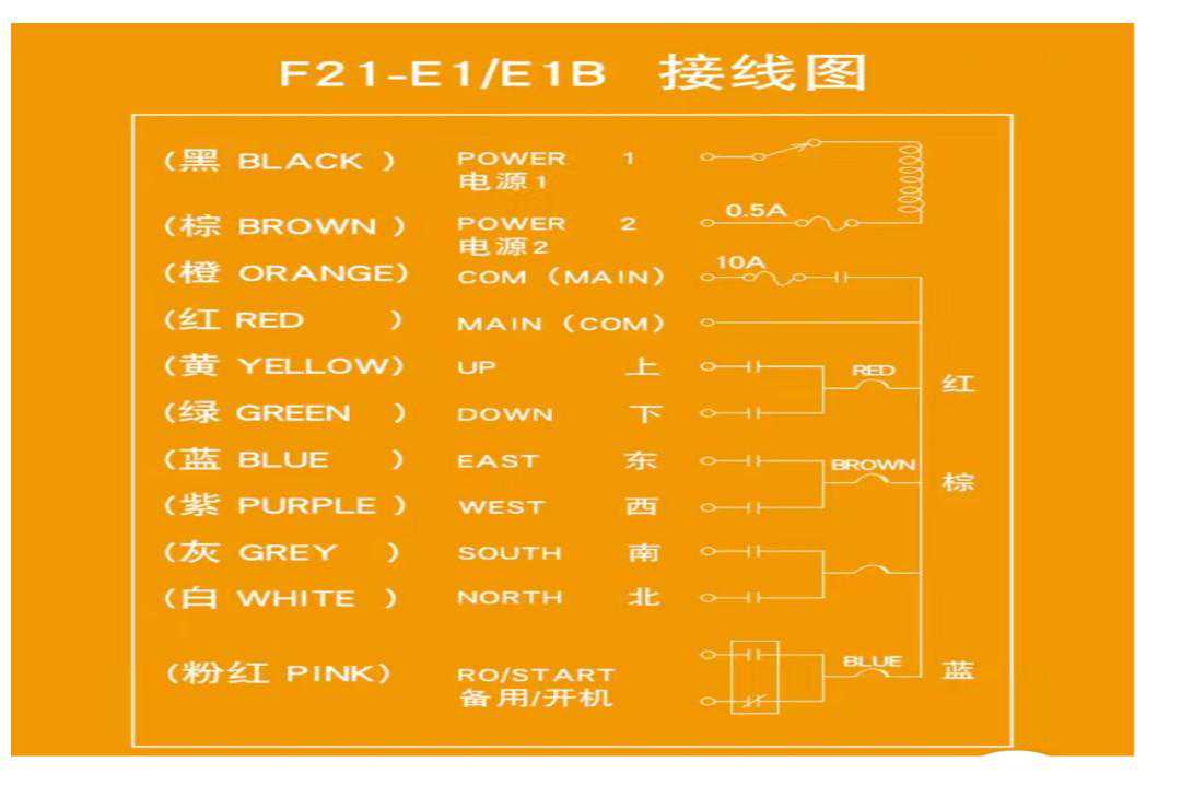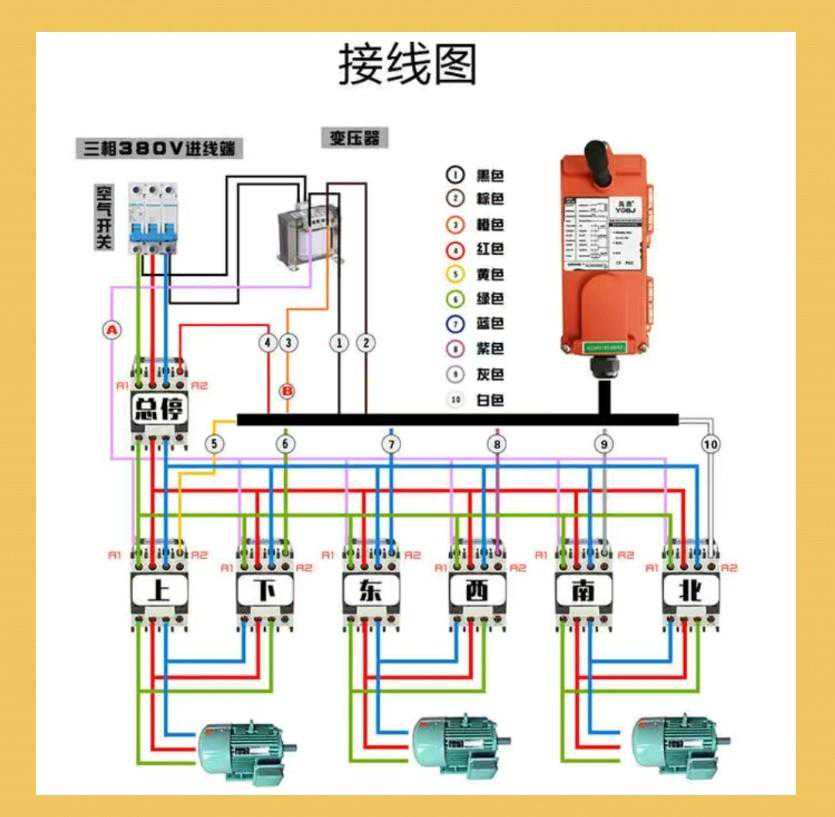 ❺接收机出来的各色线,直接控制电箱内的各功能接触器。上下,东西,南北。然后有一个总的电源接触器。我们只需要按号码或者颜色线号去对应相应的接触器就好了,非常简单。我们来看一下他们常用的电路图: