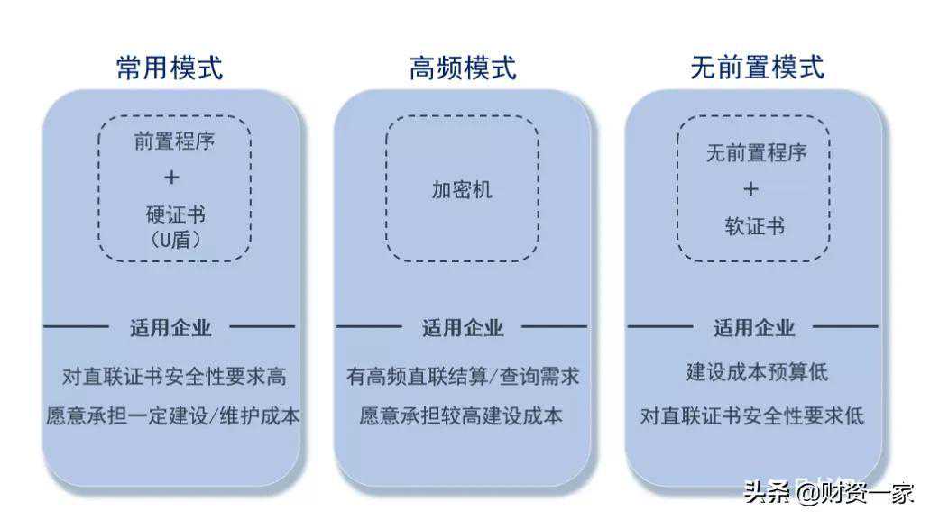 根据企业接入直联是否需要前置机、使用何种证书形式等方面来区分,目前国内银企直联的接入方式可以组合出常用模式、高频模式和无前置模式三种不同的接入模式(图2)。