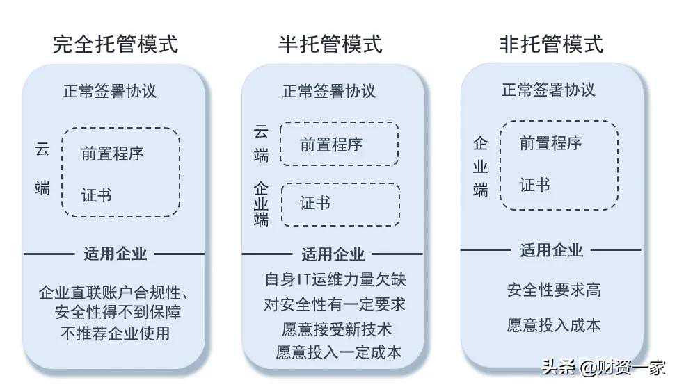 第一个分支是证书托管,这种分支模式下企业与银行间的银企直联协议仍需要照常签署,企业端不需要部署前置机,前置程序部署在云端(无前置模式除外),软证书或者前置机U盾也完全托管给云平台供应商。这种模式下,虽然云平台一般会在关键操作时需用户通过输入密码等方式进行鉴权,但理论上云平台提供者具有企业开通的该证书下的所有直联服务权限。举一个类比的例子,股票和期货交易资金全部是受银行监管的特殊账户内由用户自行操作交易完成,但证券公司和期货公司都不曾获得客户的账户全部权限,因此企业直接转移集团名下全部账户权限(载体为软证书或者U盾等物理介质)交给第三方在合规性上会有较大的争议。