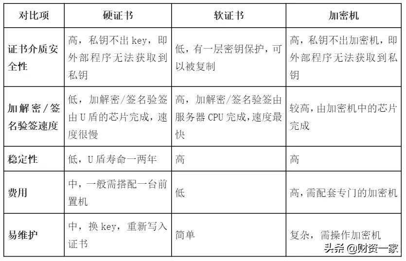 银企直联的证书形式可以分为三种:一是硬证书,即采用U盾形式,包括普通U盾和高速U盾;二是软证书,即以文件形式;三是加密机,也就是证书存储在加密机中,前置程序也安装在加密机中。各类证书形式的介质安全性、加密解密速度、稳定性、所需费用以及维护难易度各不相同,具体如表1。