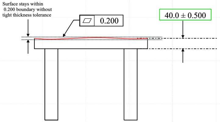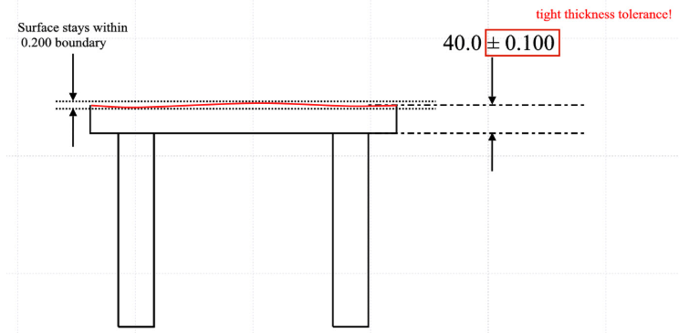 案例如果你想确保桌面是完全平坦的,而没有采用表面平面度,则不得不非常严格地限制桌子的厚度,以确保整个表面是平的;采用平面度,你就可以在不严格限制桌面厚度的情况下保证桌面平坦。