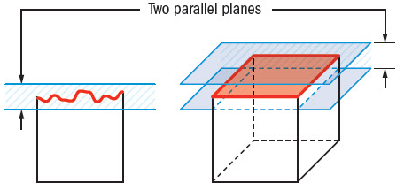 只要被测要素保持水平,就可以用高度规来测量平面度;确保表面上的任何点都不超过或低于公差带。现代三坐标测量机是最好的测量手段,可创建虚拟平面,与真实的表面轮廓可以比较。属3D测量,提取点必须覆盖长度和宽度,以确保整个表面在公差带内。