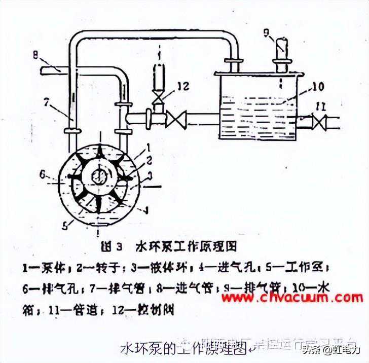 水环泵工作轮2在泵体1中旋转时形成了水环3和工作室5,水环与工作轮构成了月牙形空间。右边半个月牙形的容积由小变大,形成吸气室。左边的半个月牙形的容积由大变小,构成了压缩过程(相当于排气室)。被抽气体由进气管8和进气口4进入吸气室。转子进一步转动,使气体受压缩,经过排气口6和排气管7排出。排出的气体和水滴由排气管道7进入水箱10,此时气体由水中分离出来,气体经管管道9排到大气中,水由水箱进入泵中,或经过管道11排到排水设备中。