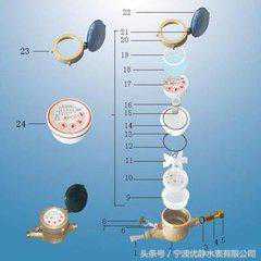 1-接管;2-连接螺母,3-密封圈,4-夹紧圈;5-压紧圈;6-计数器;7-防磁环;8-传动齿轮组件;9-盖;10-垫圈;11-O形密封圈;12-锁紧螺钉;13-螺母;14-铅封;15-铜丝;16-滤水网,17-齿轮盒组件;18-调节片;19-开槽盘头螺钉;20-顶尖;21-叶轮组件;22-表壳;23-齿轮盒盖