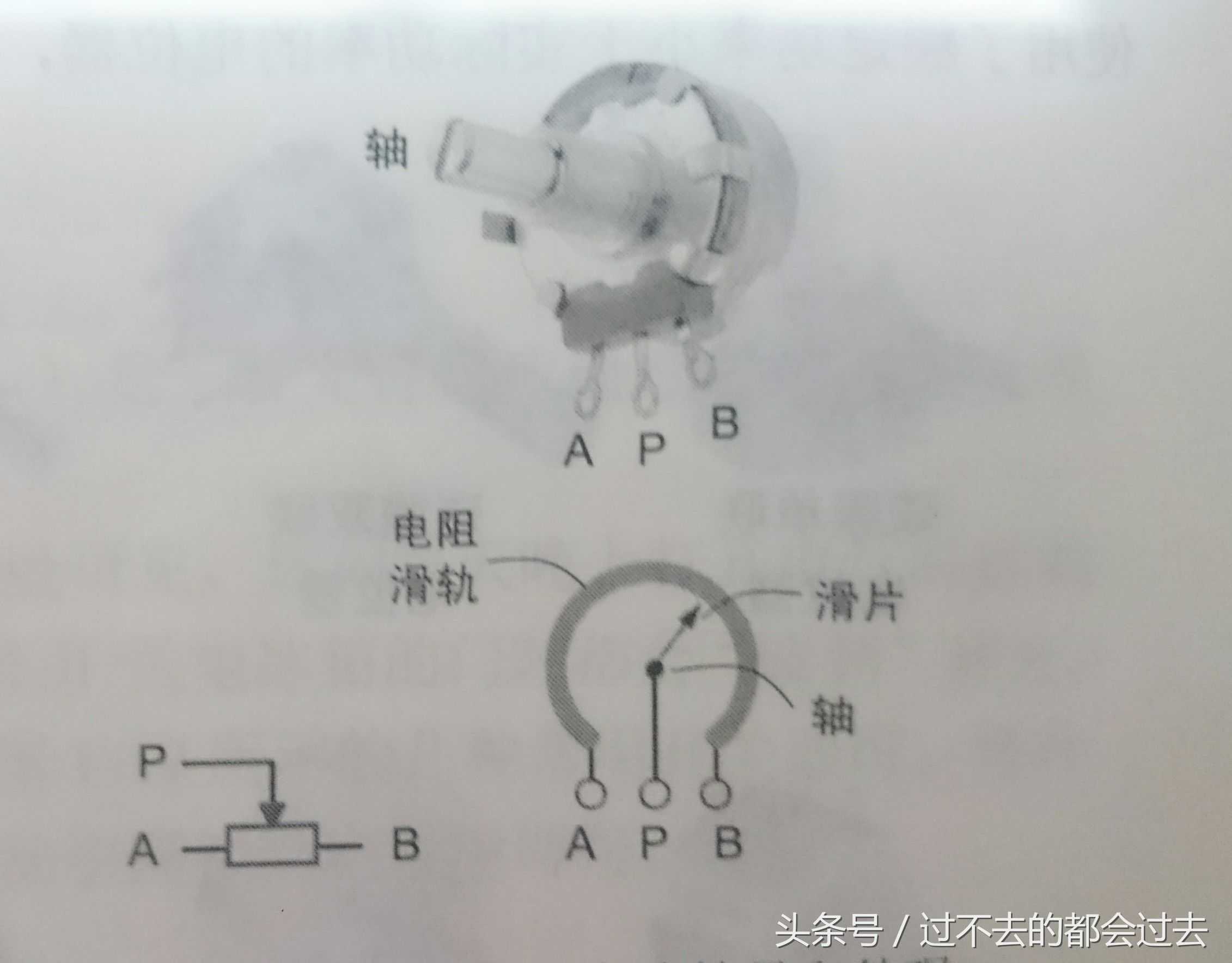 下图中,电位器电路图型符号形象的表示出电位器A,B脚是一个电阻的两端,而P脚链接在一个能在电阻滑轨上接触行走的滑片。从结构图知,当用手拧动电位器的轴时,滑片在电阻的滑轨上行走,当调节停止后,滑片所在位置决定了电位器P脚与A脚,P脚与B脚之间的电阻。比方说,A,B两脚之间电阻为10kΩ,而滑片停留在电阻滑轨正中间,则P脚与A脚之间的电阻和P脚与B脚之间的电阻相同,都是5kΩ。