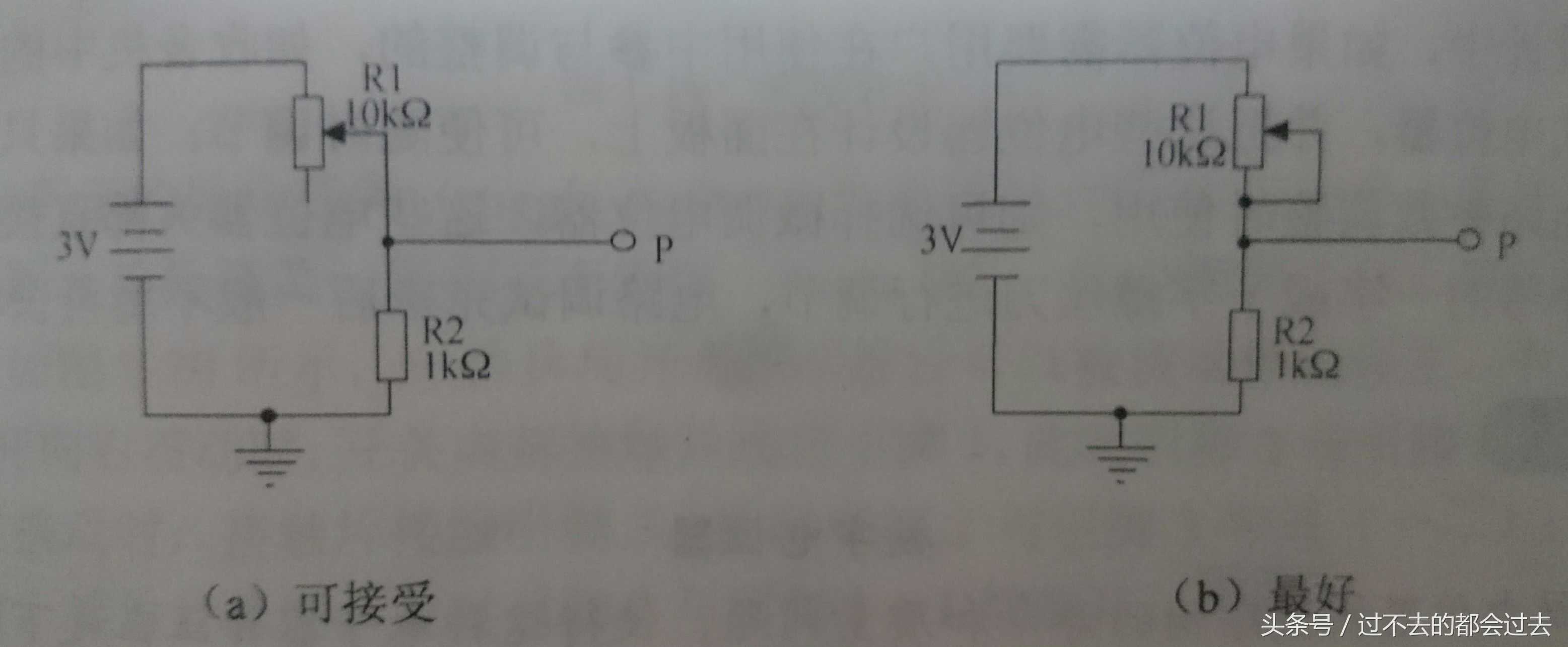 由于电位器是一个带有机械结构的电阻可变器件,其滑片及电阻滑轨之间可能会因为寿命或质量原因问题而脱落,这会使A,P脚之间和B,P脚之间变为无穷大。这就会导致这个电位器没有阻值,如果后面还有其他电路,则无法正常工作。为了在电位器出现故障时减少灾难程度,可按下图那样,把P脚与电位器任意一端相连,这样不但可使电位器发生相同作用,还可保证在滑片与滑轨脱离时,电位器的接入电阻与其标称阻值相同,电路不至于出现太大异常。