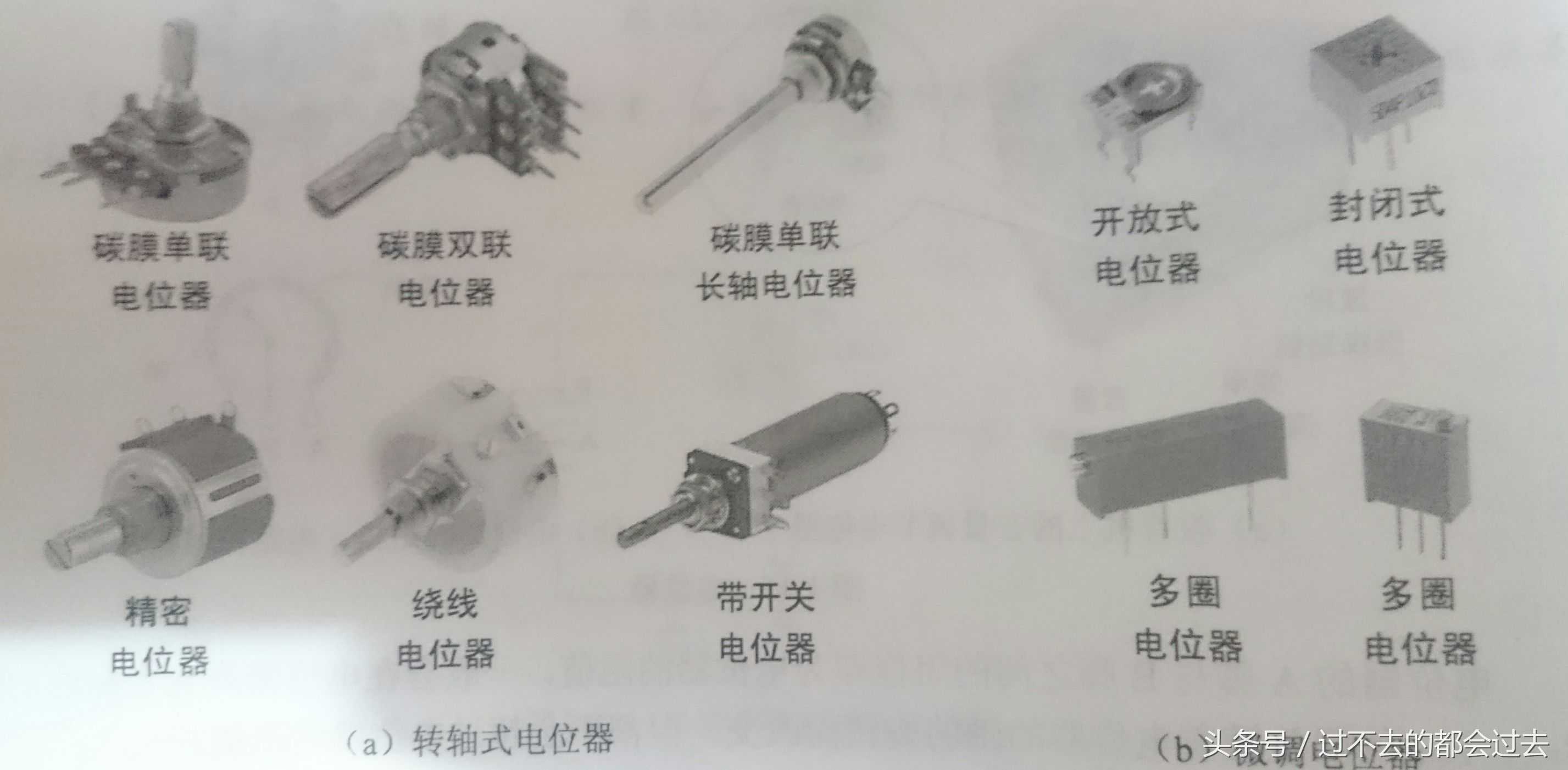 电位器和普通电阻一样,除了有阻值参数外,还有功率和种类之分。常用的电位器有转轴式和微调式两种,其中各自又有一些不同类型的电位器,如下图。