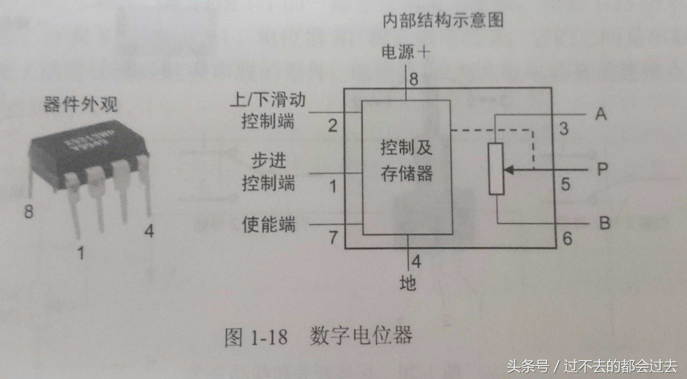 由于传统电位器机械结构的寿命和质量问题,使得这种电子器件正在走下坡路,取而代之的是数字电位器。数字电位器彻底颠覆了传统电位器的结构,使用的是电子来实现阻值的改变。下图为数字电位器的外观和结构架图,只要在步进控制端输入脉冲,就能改变“滑片”P的位置(滑片在器件中不存在,而由一些电路结构取代),实现阻值的连续可调。