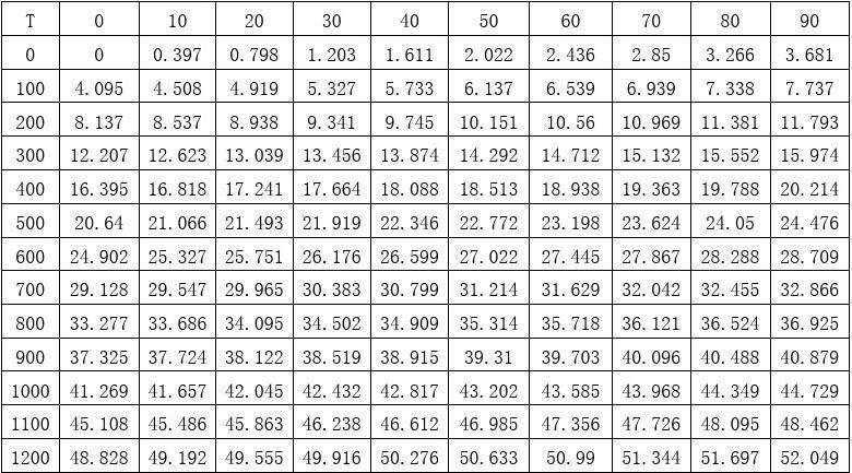 材质不同测量的温度范围也有不同,每一种材质的特点和应用场合如图所示。K型热电偶的分度表