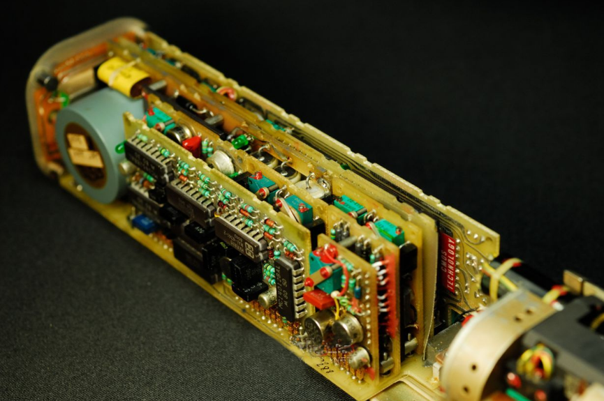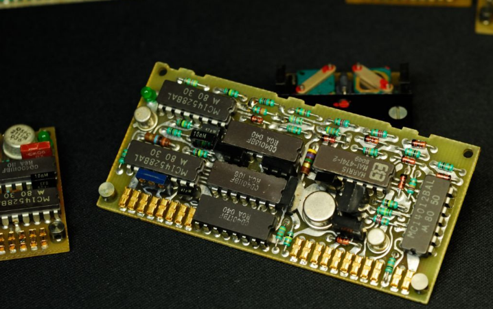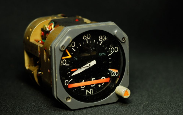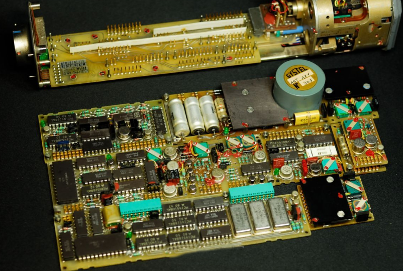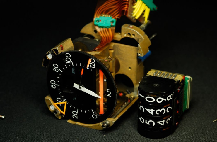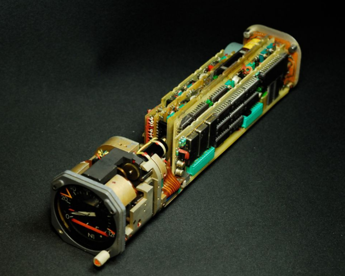 可以看到模块上基本都是陶瓷封装的小规模集成电路,生产于1980年左右。此时的航电设备正处在机械式到电子的过渡时期。由于显示技术和通讯总线技术还不成熟,此时的仪表往往采用模拟信号,由电路处理后再通过一些特殊的机电显示器件,以比较接近传统机械式仪表的指针/转轮等方式呈现。