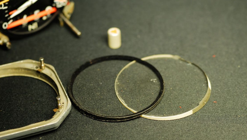 表盘玻璃,看似很普通,其实是两片一边薄一边厚的玻璃叠成。没猜错的话应该是用于折射照明灯的光线,使得表盘亮度均匀