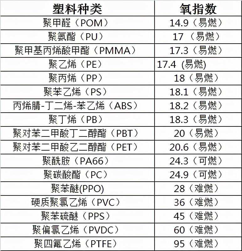 各种塑料的氧指数如下表: