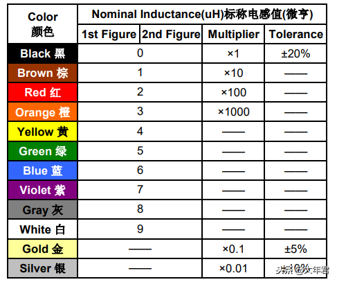电感的色标法与电阻的色标法类似,都是用不同颜色的色环标识在电感上,用色环标识时候,一般露出电感体本色较多的一端为末环,它的另一端就是第一环,用色环标识在电阻上面单位是欧姆(Ω),在电感则是微亨(μH),一般有三环和四环表示,前2位数字是有效数字,第3位是倍率,如果有第四位则是表示误差等级。标称电感值用色码编码表示如下表所示。