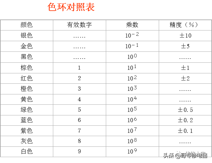 四环电阻:半精密电阻,误差2%,多为碳膜电阻(RT);四环电阻读取时金(银)色环放置右端,依次序从左向右读取;