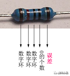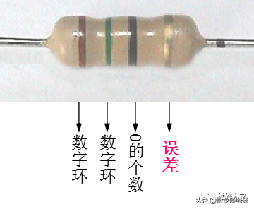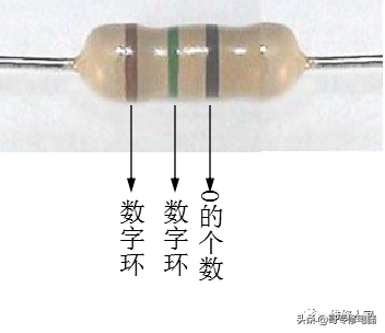 第一、二环为数字环,第三环表示0的个数,合起来代表的数字即为电阻的阻值;