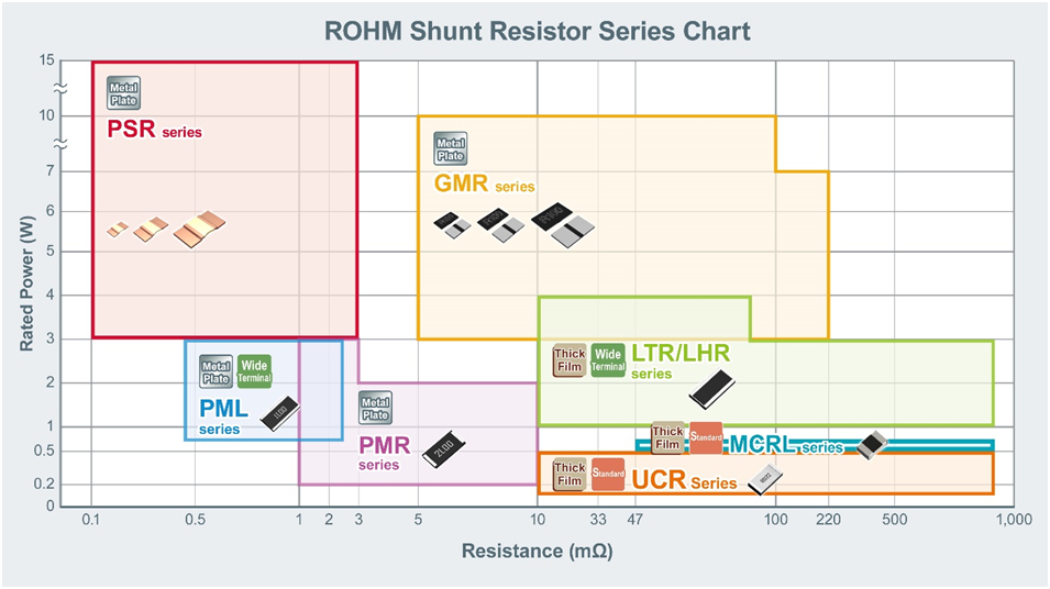 ROHM提供了丰富的产品阵容,可以满足各种应用对额定功率和电阻值等性能变量的不同需求。下图展示了ROHM的各系列分流电阻器及其性能范围。