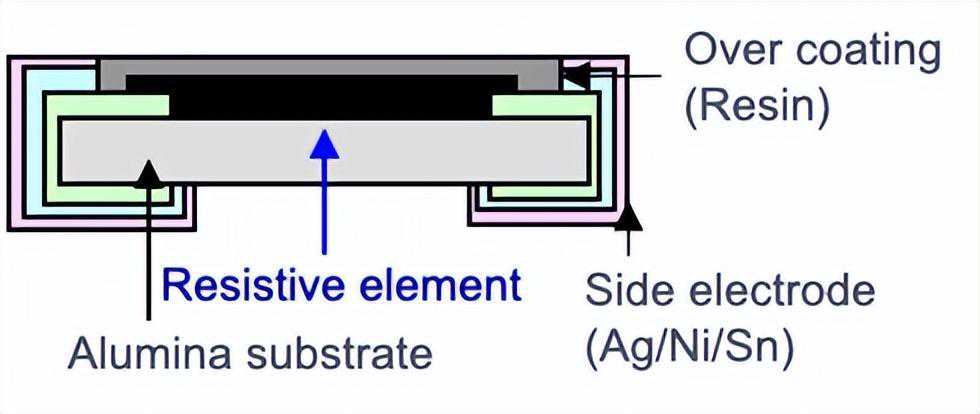 检流电阻器有两种不同的制造方式。第一种是基于传统的厚膜电阻结构,如下图所示,即在陶瓷衬底上印刷电阻膏经过烧结后,用激光调阻使电阻达到目标阻值,再经过涂装和组装,最终制成表面贴装型电阻器。