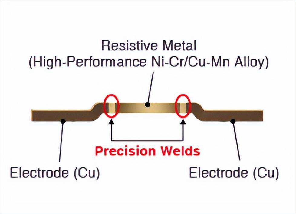 第二种方式是使用金属合金作为电阻结构,将其直接焊接到接触电极上。合金配方对于确定阻值及其热特性至关重要。这种电阻结构具有出色的功率和热性能表现,但其制造成本较高。下图给出了一个示例。