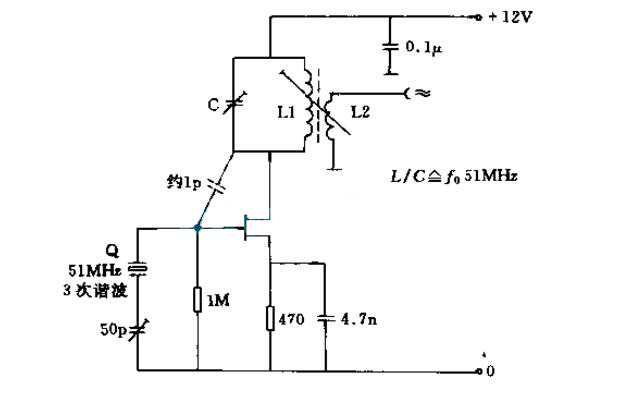 该振荡器以51MHz(17MHz3次谐波)晶体工作。根据结构的不同,漏—门极间电容可选取0.5—1.8pF。L2匝数约为L1的20%。通过470Ω源极电阻可以改变振荡特性。