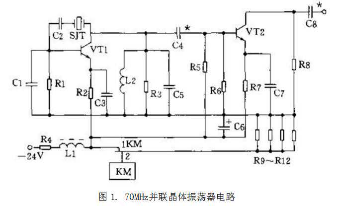 电容C1为20p,C2为100p,C3、C7为820p,C4为56p,C5、C8为47p,C6为47u/50V。电感L1为22uH(色码电感),L2为0.3uH。电阻R1为1.6kΩ,R2为1kΩ,R3为750Ω,R4为180Ω、1W,R5为1.3kΩ,R6为3kΩ,R7为360Ω,R8为470Ω,R9—R12为300Ω、2W。三极管VT1、VT2选3DG82B,65≤β≤115。晶体SJT用JA9B型-70MHz。继电器KM为JUC-1M。