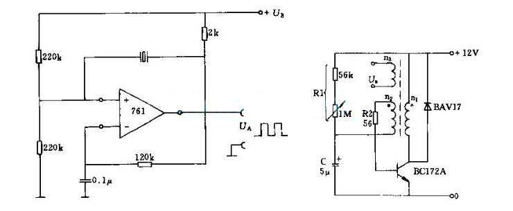 采用运算放大器的晶体振荡器电路。此电路采用761运算放大器,输出脉冲频率可达10MHz。2kΩ电阻用来作运算放大器输出级集电极开路的负载。