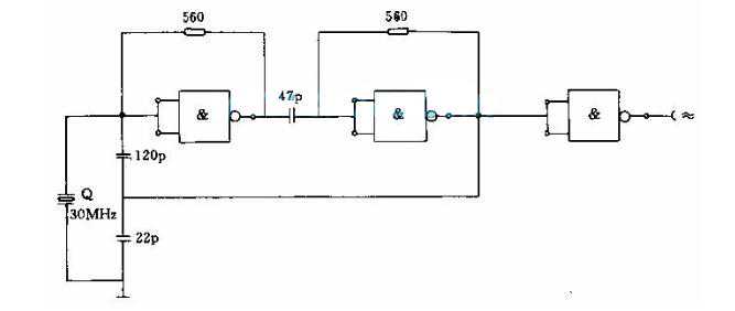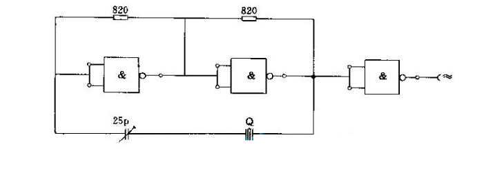 该电路由TTL集成电路(745000)构成。利用石英晶体频率的3次谐波工作。振荡性能靠精确选择47pF电容(10—100pF)来保证。输出电压约3.5V(峰—峰值)。