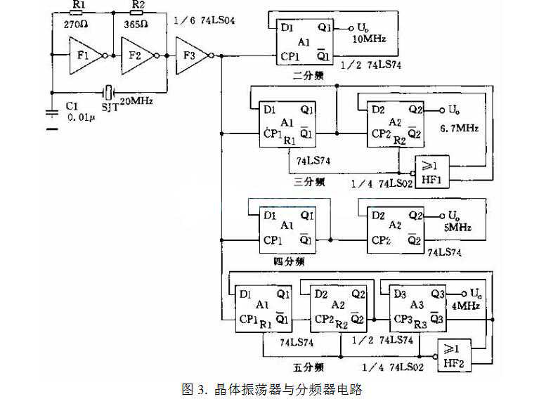 这个简单又廉价的晶体振荡器由74LS04的两个门及外围元件组成,电路如图3所示: