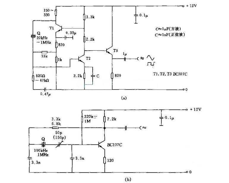 图(a)和(b)示出两个2MHz振荡器基本电路。根据电路结构,通过试验调整可以确定出其最佳工作点。