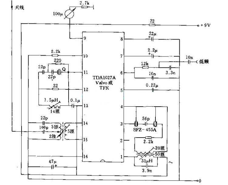 带石英晶体振荡器的无线电收音机电路。该电路频率可致27MHz。中频为455kHz。为了增大接受功率,这里采用了场效应晶体管前置级。