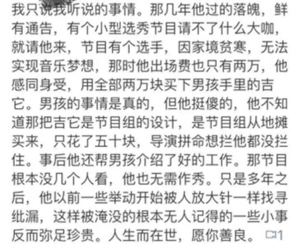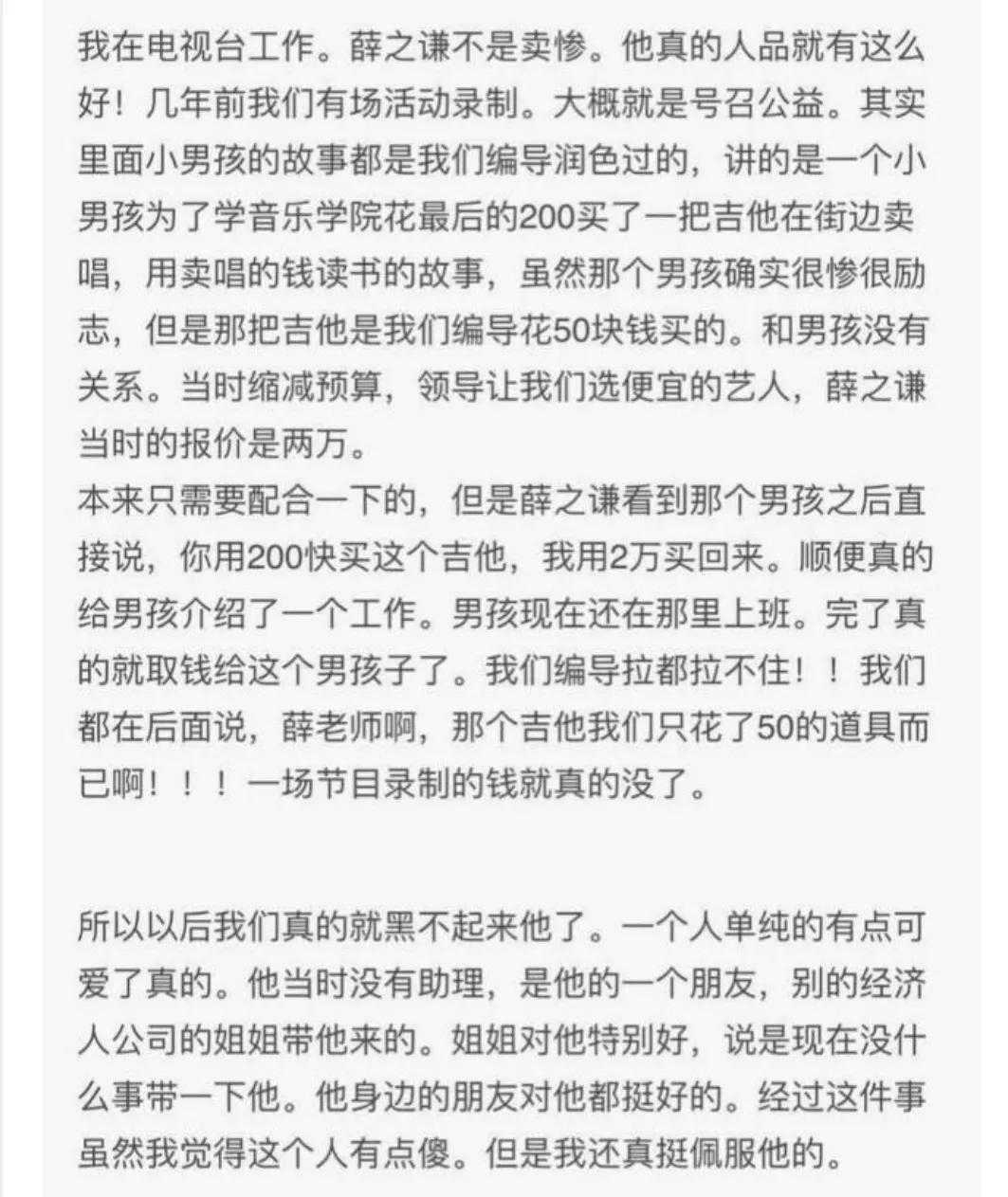 或者有人说娱乐圈当中哪有那么善良的人,当你真正走进他的歌词,看过他的采访,就读懂了他一点,他活的很真实!无关人设,因为一个人设存活不了十六年!不满节目黑幕为了公平公正去揭开节目组黑幕的薛之谦并不是不知道自己将要承担什么,他依旧选择这么做,不想那群孩子的梦想被人践踏,被人揉碎!曾经采访这样说我就用心做音乐,如果歌能红就是运气好!对于外界对于他的攻击,他用作品回击,把想说的都放在歌里了!至于有些事情时间会证明一切,会证明清者自清,浊者自浊,那我们就把那些所谓的东西放给时间吧!我更不会用自媒体去评价那些所谓的事非对错!交给时间,交给公正或许才能得到答案!最终音乐才是他的归宿,他说离开音乐他就真的只剩下生活了!