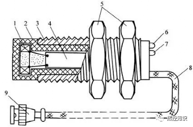 1—电涡流线圈;2—探头壳体;3—壳体上的位置调节螺纹;4—印制线路板;5—夹持螺母6—电源指示灯;7—阈值指示灯;8—输出屏蔽电缆线;9—电缆插头