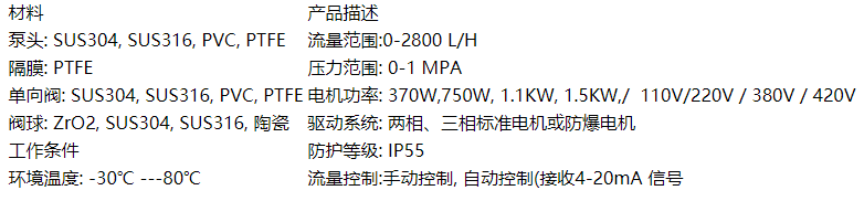 次氯酸钠卸料泵是由电机驱动的机械隔膜计量泵,适用于低压力场合的流体精确计量,有多种材质泵头可选,膜片统一采用多层复合PTFE材质。因其具有很高的计量精度和稳定性能及极高的使用工求,而广泛应用于污水处理,食品剂添加,各种特殊介质的输送。