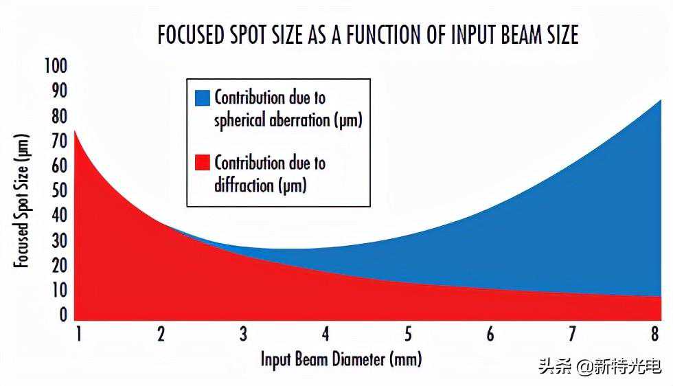 图7:在较小的输入光束直径下,聚焦光斑尺寸受到衍射限制。随着输入光束直径的增加,球差开始控制光斑大小