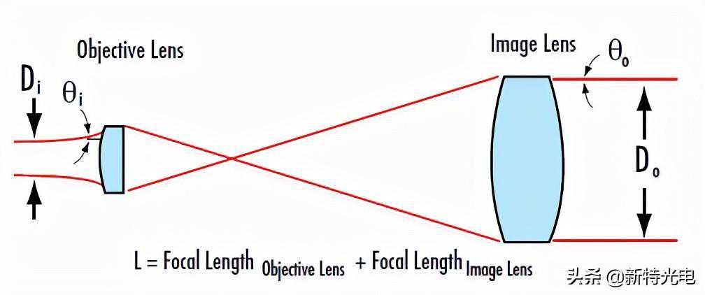 激光扩束镜可将准直输入光束的直径扩大到更大的准直输出光束。扩束镜常用于如激光扫描、干涉测量或遥测应用中。现在的激光扩束镜都是从完善的光学望远镜基础中发展而来的无焦系统设计。在此类系统中,物体光线以平行方式进入内部光学元件的光轴中,并以平行方式离开。这意味着整个系统不具备焦距。