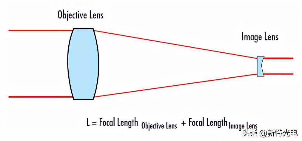 伽利略式望远镜由正透镜和负透镜组成,透镜也按焦距总和分隔(图2)。但是,由于其中一个透镜为负透镜,因此两个透镜之间的距离比开普勒式望远镜的透镜距离短。使用两个透镜之间的有效焦距能够很好地得出近似总长度,而使用后焦距则能够获得最准确的长度。