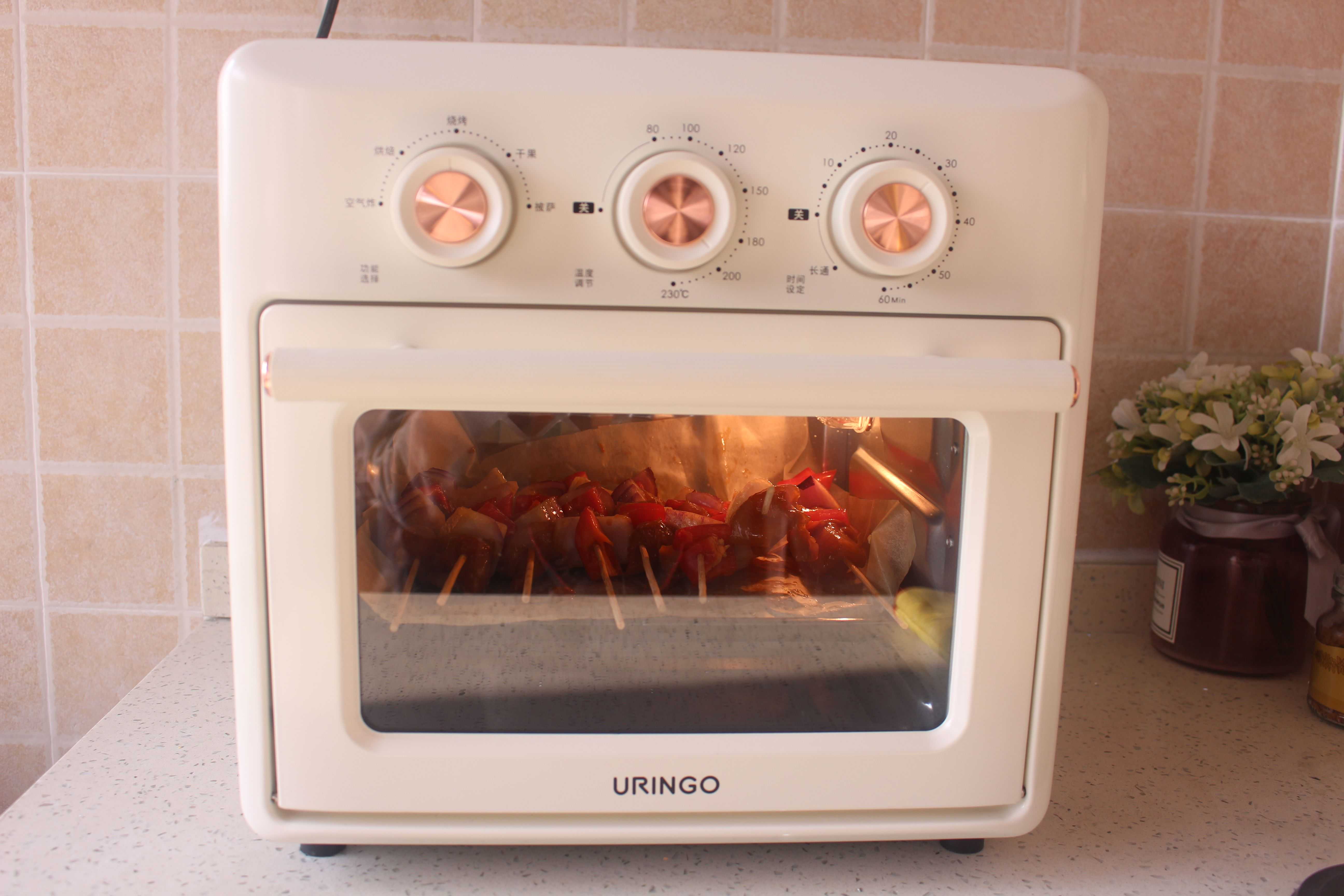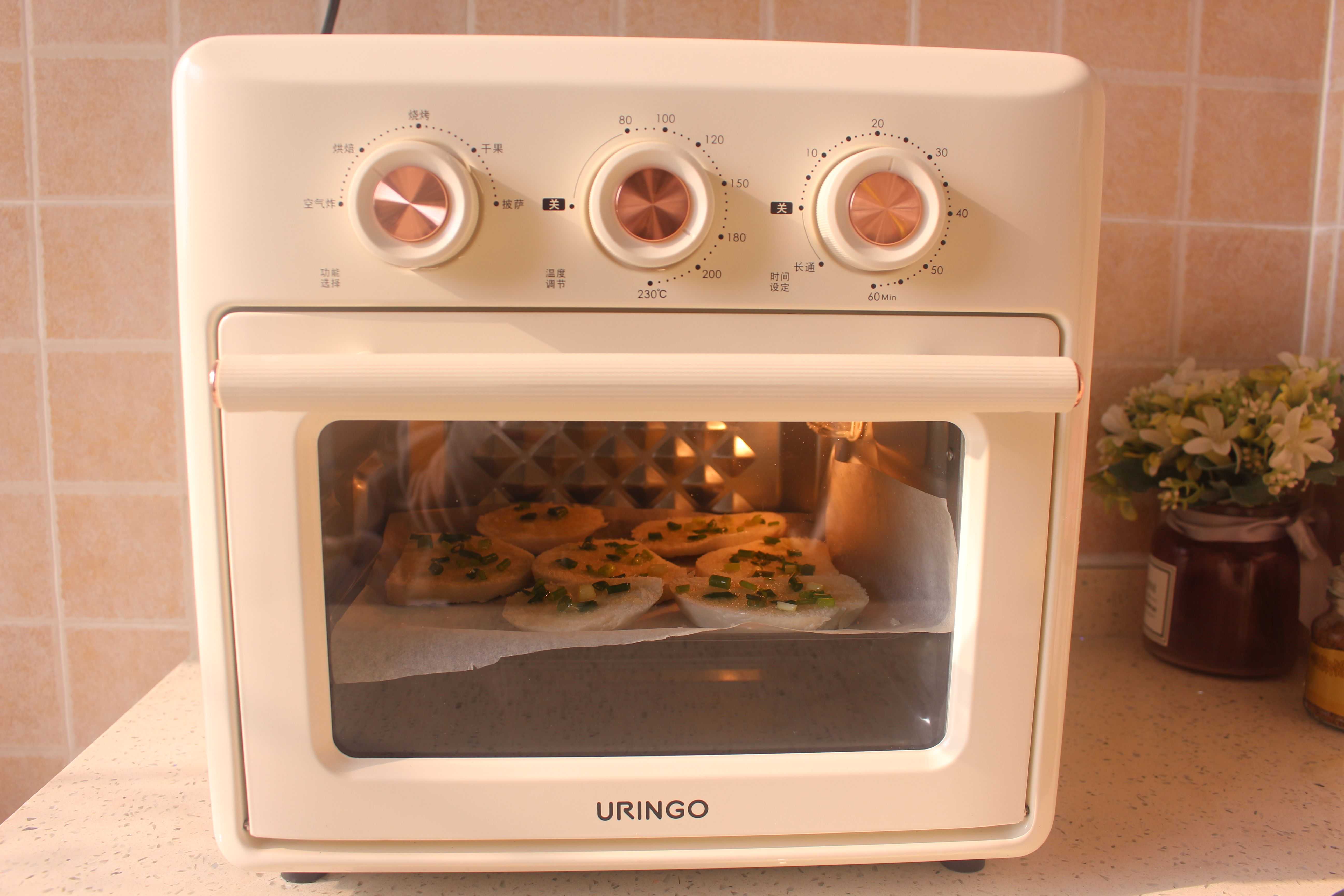 从左到右依次是功能旋钮、温度旋钮和时间旋钮。功能可以选择空气炸、烘焙、烧烤、干果、披萨,还可以做爆米花呢。烤箱的温度控制在80℃-230℃,80℃平时可以用来解冻一些冷冻的食品,平时烤蒜香排骨的时候,选择230℃,出箱时,满屋子都是排骨的香味,入口的时候,并没有很多的油脂,紧锁肉汁。