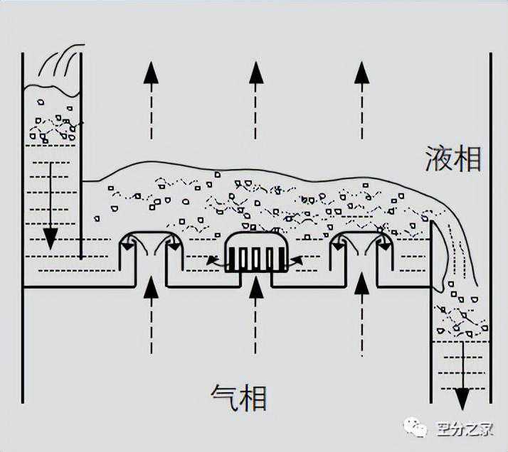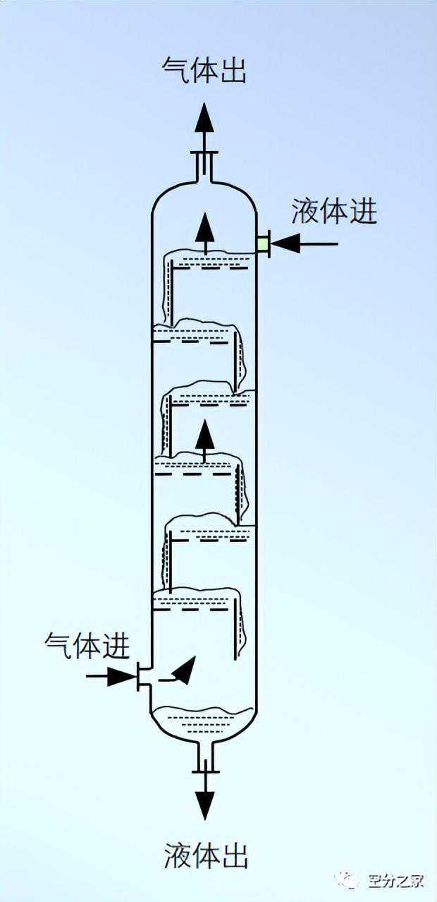 在圆柱形壳体内按一定间距水平设置若干层塔板,液体靠重力作用自上而下流经各层板后从塔底排出,各层塔板上保持有一定厚度的流动液层;气体则在压强差的推动下,自塔底向上依次穿过各塔板上的液层上升至塔顶排出。气、液在塔内逐板接触进行质、热交换,故两相的组成沿塔高呈阶跃式变化。