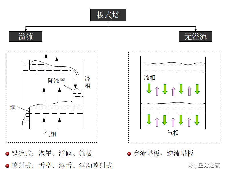 溢流塔板:塔板间有专供液体溢流的降液管(溢流管),横向流过塔板的流体与由下而上穿过塔板的气体呈错流或并流流动。