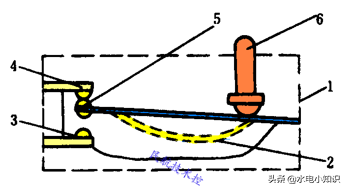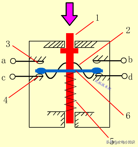 组成:1.壳体2.弹簧片3.常开触点4.常闭触点5.动触点6.推杆