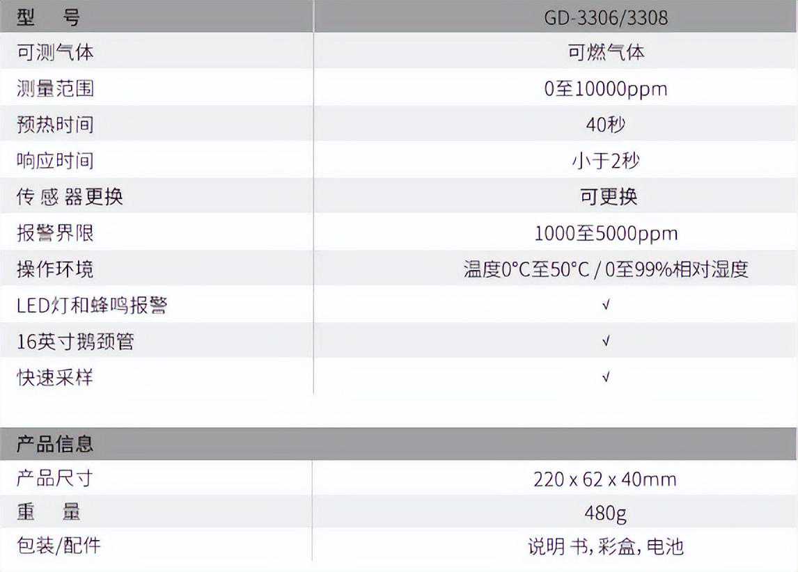 值得一提的是,GD-3308采用双注塑设计,坚固耐用,以及明亮LCD大屏、高度灵活的16英寸柔性可弯曲鹅颈管,检测灵敏度高,能及时识别和定位燃气等泄露气体。该产品主要用于检测甲烷和以甲烷为主要成分的天然气等可燃气体,被检测的可燃气体成分包括氢气、异丁烷和乙醇等,即使是低浓度的可燃气体也可以在几秒钟内检测到,目前已广泛应用于燃气、石油化工、环保、暖通等领域。
