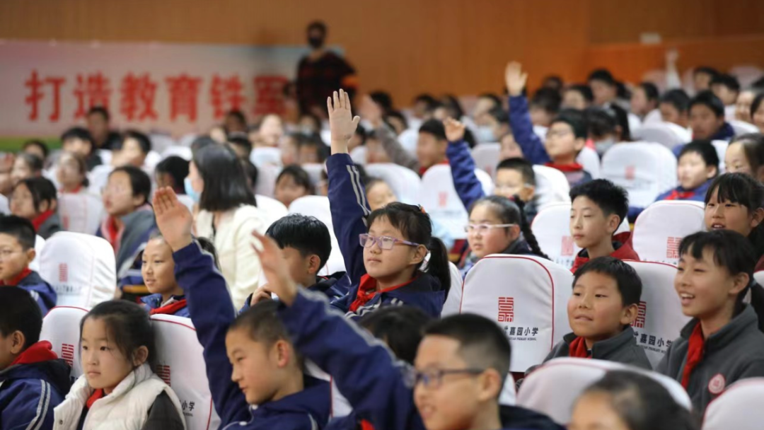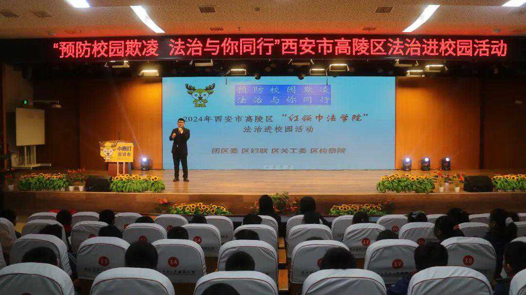 全场同学在小鹿灯未检检察官的带领下整齐有力地跟读,一场预防校园欺凌法治讲座正在高陵嘉园小学报告厅进行。