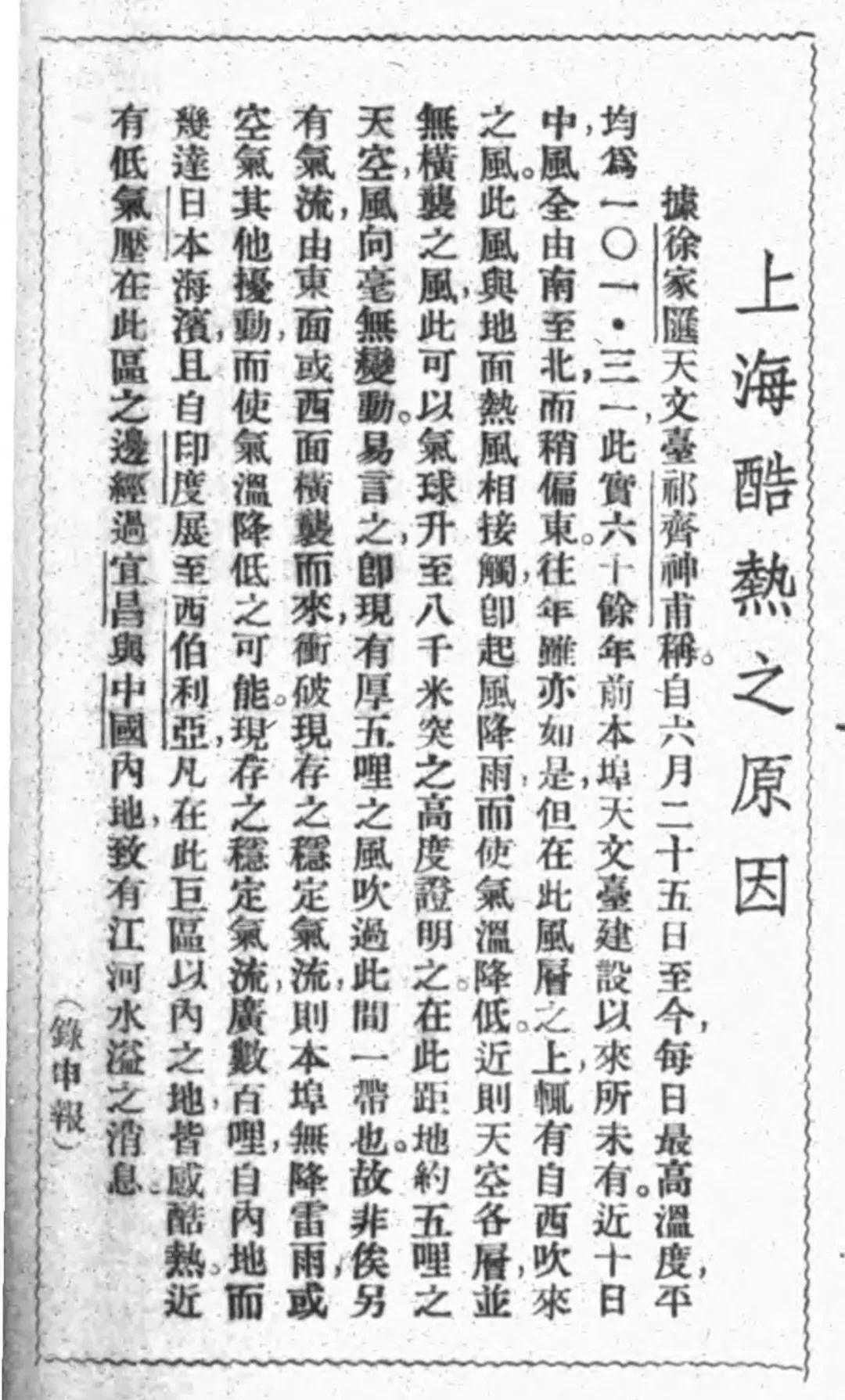 《申报月刊》1934年第三卷第七号刊登“上海酷热之原因”一文。由徐家汇天文台工作人员详解缘由