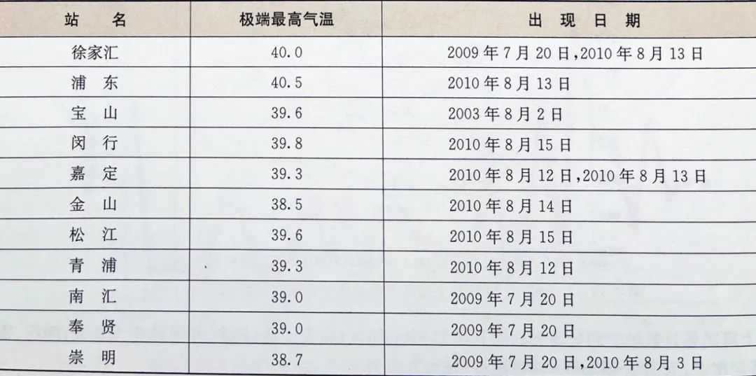 1978—2010年,上海11个气象站观测到的极端最高气温出现在浦东,为2010年8月13日的40.5°C,其次为徐家汇站2009年7月20日及2010年8月13日的40.0°C。