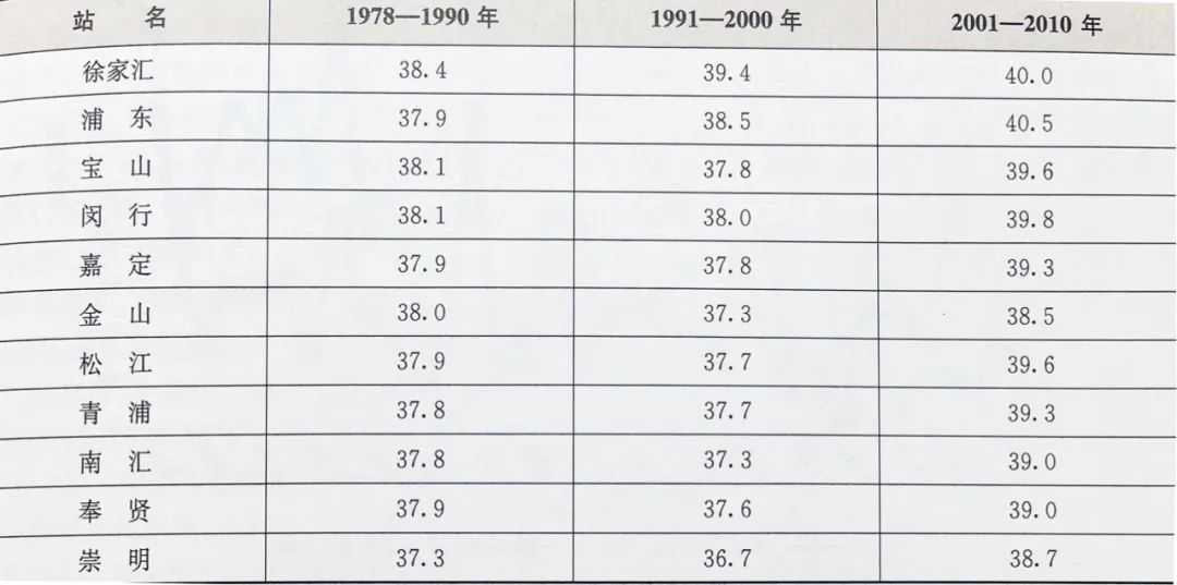 《上海气象志》《上海市志·气象分志(1978—2010)》记载:据1961—1990年统计,夏季高温日数以市区(龙华站)最多,年均7天,其次是上海、青浦、宝山和嘉定等区县均在6天左右,金山、松江县在5天左右,其他地区为2~4天。高温年,地区差异更为明显,如1971年市区(龙华)、上海、宝山、嘉定、青浦等区县,全年最高气温≥35℃的日数在21~27天,而近海的南汇县仅4天,崇明县陈家镇也只有6天。1961—1990年出现的最高气温,最高为上海县的38.5℃,最低为崇明县的37.3℃,其余均在38℃左右。